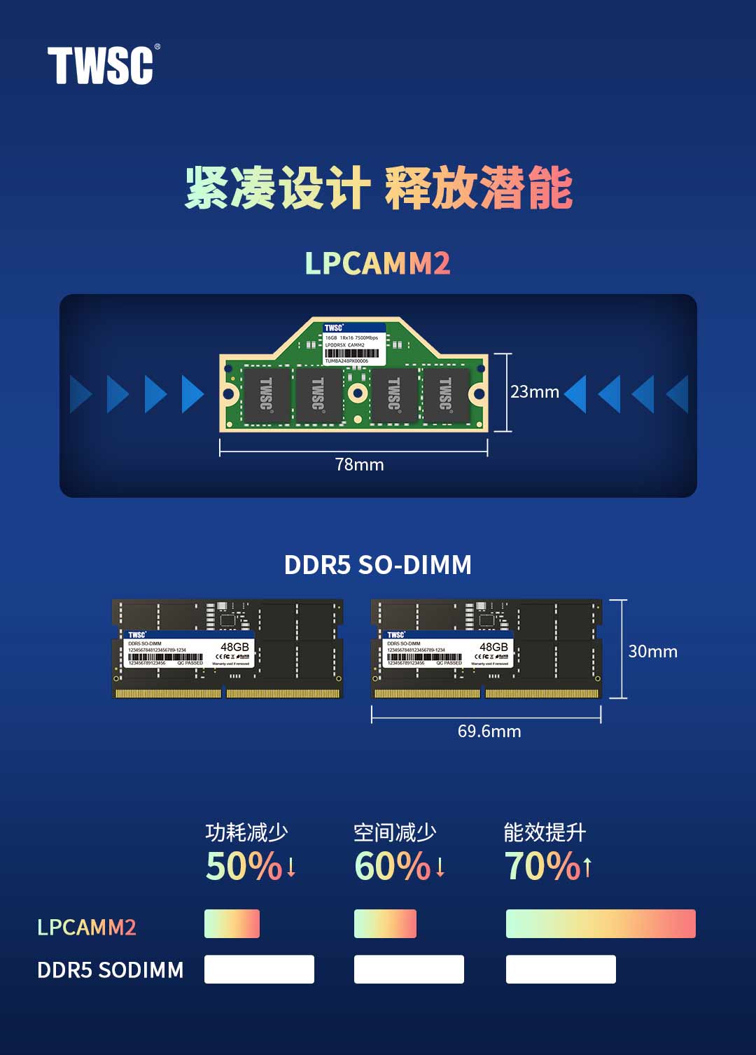 LPCAMM2的小體積設(shè)計比傳統(tǒng)SODIMM節(jié)省60%以上的空間,單個LPCAMM2模塊即可代替兩個SODIMM,簡化設(shè)備的擴容、維護(hù)和升級過程。德明利LPCAMM2提供了可拆卸的內(nèi)存解決方案,這種靈活的結(jié)構(gòu)設(shè)計使用戶無需更換主板,即可輕松升級內(nèi)存模塊,延長了系統(tǒng)的使用壽命和可持續(xù)性,降低了設(shè)備維護(hù)成本和操作難度。